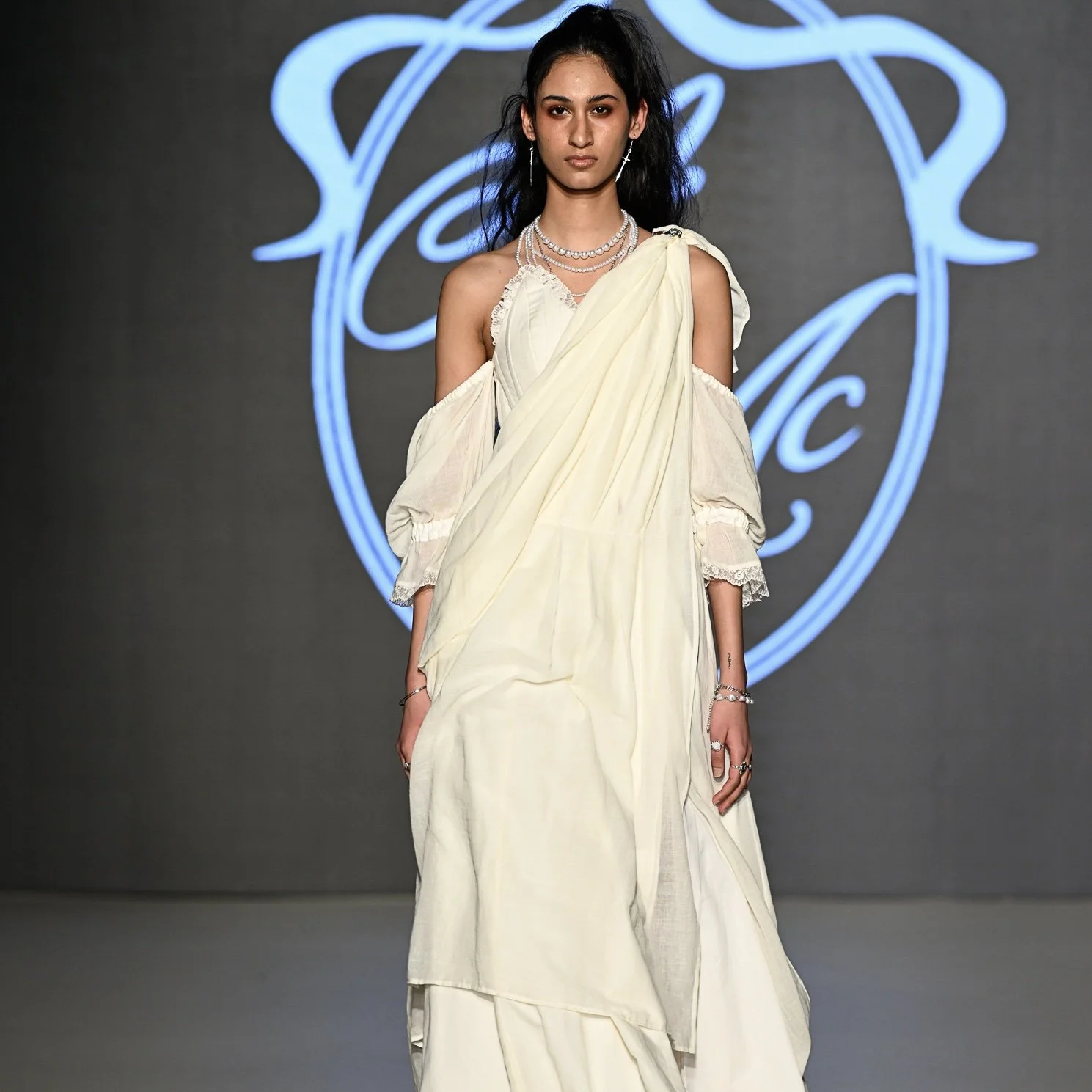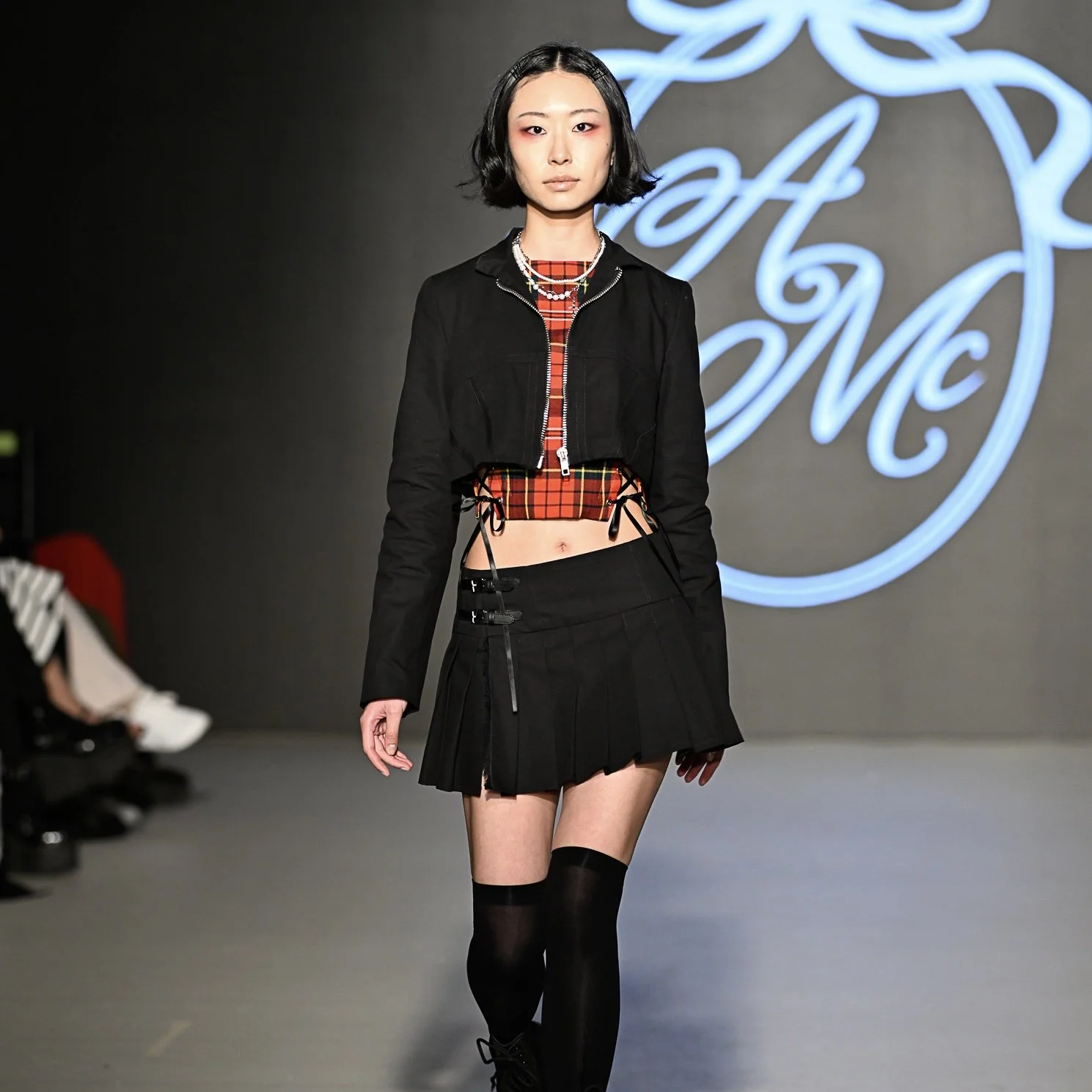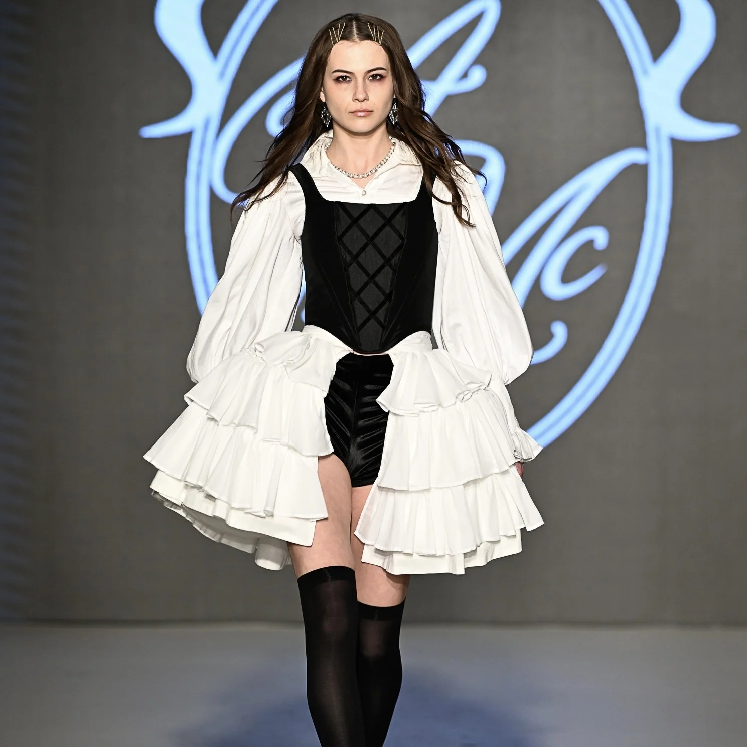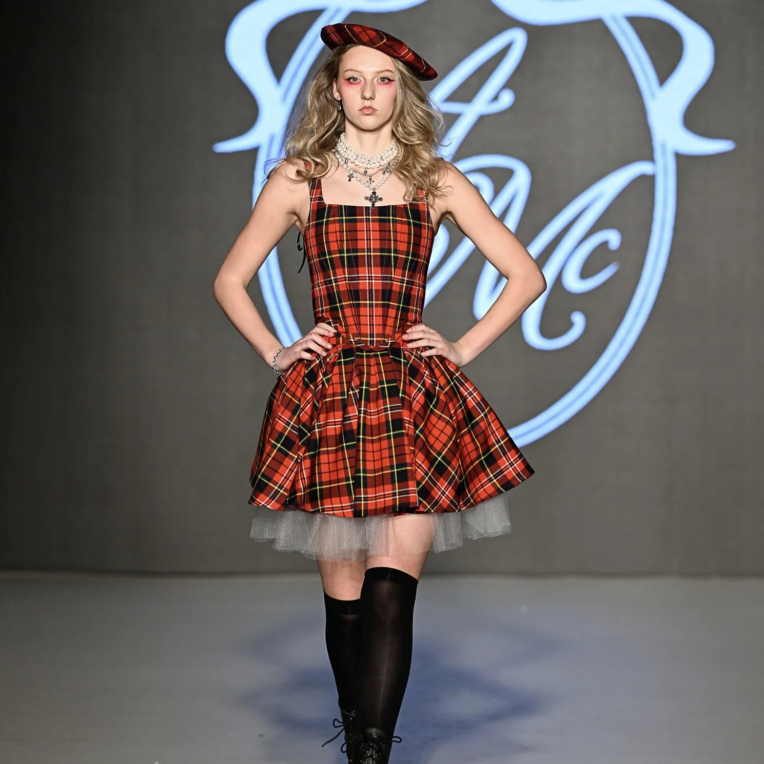 This collection, entitled Premonition, is an exploration into the rich themes of history, feminism, and the power of women through the lens of fashion. Drawing inspiration from figures such as Queen Elizabeth I, to mythological goddesses of the ancient world, the influence of women is front and centre in this collection. Rich, sumptuous materials such as velvet, taffeta and tartan wool represent the structure and elegance of Royalty. While soft, airy cottons and vintage laces provide a juxtaposition of ethereal femininity and paganistic visions of natural beauty. All the while, modern alternative elements and styling help to create a powerful, rebellious collection for a young woman of the modern era.